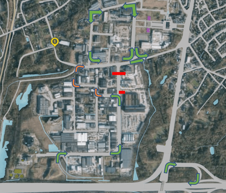 Alle verkeer komende van het zuidelijk industrieterrein, zal de huidige omleiding 1 (MRSTeam – Soloya – Frepa) dienen te volgen (oranje pijlen op onderstaande schets).